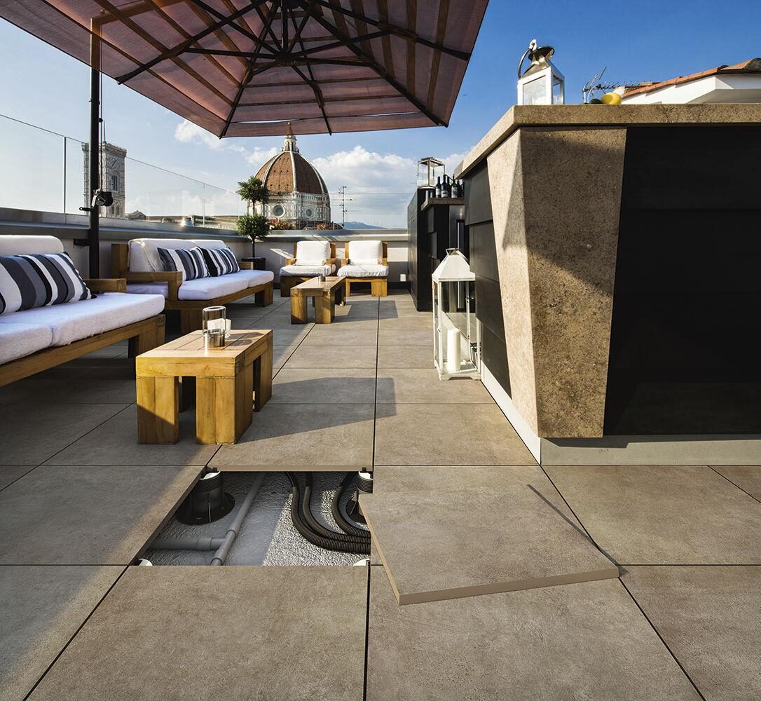 Durabilité : La combinaison du grès cérame à forte épaisseur et de la pose sur plots offre une solution durable et résistante. Le carrelage conserve sa solidité et sa stabilité, même dans des conditions environnementales difficiles, telles que les variations de température, les rayons UV et les intempéries.